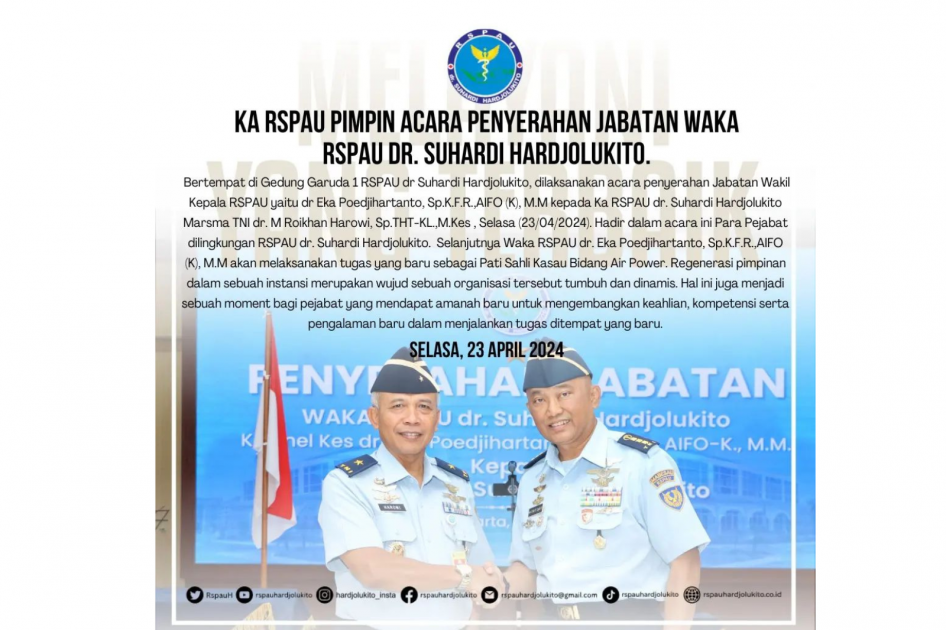 Bertempat di Gedung Garuda 1 RSPAU dr Suhardi Hardjolukito, dilaksanakan acara penyerahan Jabatan Wakil Kepala RSPAU yaitu dr Eka Poedjihartanto, Sp.K.F.R.,AIFO (K), M.M kepada Ka RSPAU dr. Suhardi Hardjolukito Marsma TNI dr. M Roikhan Harowi, Sp.THT-KL.,M.Kes , Selasa (23/04/2024). Hadir dalam acara ini Para Pejabat dilingkungan RSPAU dr. Suhardi Hardjolukito.
